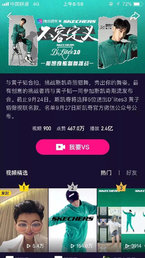 这是一个粉丝成为核心生产力的时代,当品牌代言人成为模式化的必选项时,如何打破千篇一律的套路,把代言人的魅力发掘到最大?斯凯奇邀请其代言人,同样也是微视代言人之一的黄子韬,在微视发起#斯凯奇熊猫舞#活动。有趣又接地气的合拍斗舞挑战,让从前遥不可及的爱豆一下子变得触手可及,一举触发了粉丝大军参与欲望。