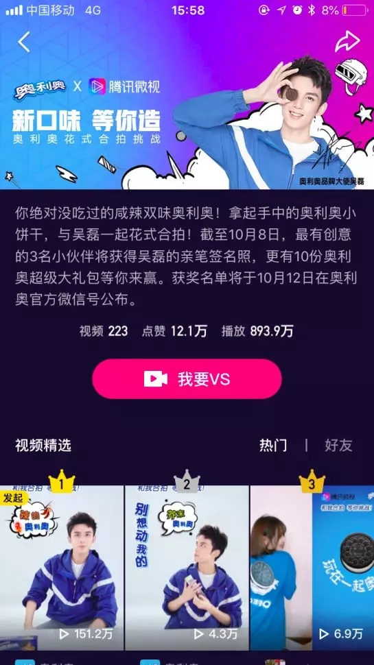 最近大热的奥利奥花式合拍挑战「新口味 等你造」活动中,就是使用了「与TA合拍」功能,通过加入了分屏视频的玩法——一个屏幕中同时出现多个画面,这样一来,追星女孩就可以通过同框与国民初恋吴磊弟弟分享一块奥利奥饼干,与爱豆同框进行甜蜜互动,活动一经推出,短时间内触发近千万曝光。